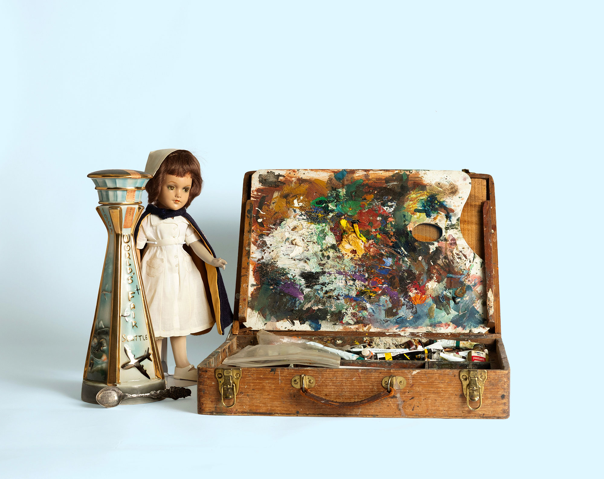 In the basement of the Allen Library, the current exhibition “Out of Scope” features a trove of unusual objects that found their way into the library over the decades. Curated by Bolcer, with Special Collections Director Lisa Oberg, ’90, and other library staff, the show puts roughly 200 artifacts on display. From fragments and architectural remnants of long-lost campus buildings and former Northwest School artist Paul Horiuchi’s paint case to artifacts of student life, such as a vintage purple freshman beanie or a 1950s dissection kit embossed with the name of its owner—a female science student.